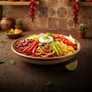 A Mexican burrito bowl is a wholesome, layered meal made with a hearty grain base, spiced beans, sautéed vegetables, and fresh toppings. It’s known for its vibrant colours, bold flavours, and balanced nutrition, making it both satisfying and nourishing.
