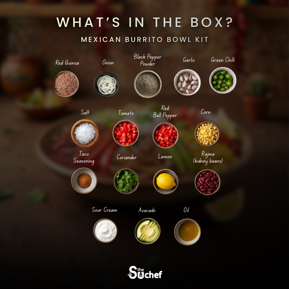 With our Mexican Burrito Bowl DIY Kit, you can easily prepare this complete meal at home. The kit brings together all the essential ingredients right from grains and beans to seasonings so you don’t need to shop for anything extra. You also get access to a step-by-step cooking guide and a video recipe on our website, making the process simple even for first-time cooks. This bowl works perfectly as a filling lunch, dinner, or a healthy meal-prep option.